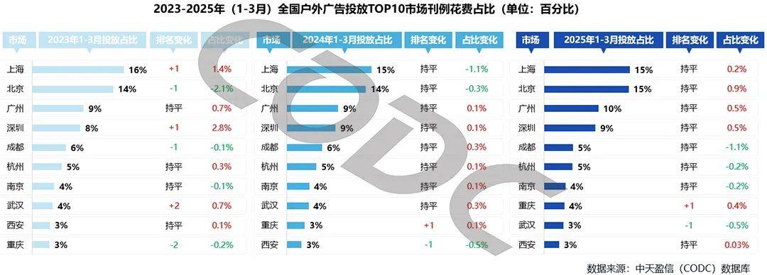 2025全国户外广告投放市场呈现出强稳定性的竞争格局,近三年TOP10市场阵容保持不变,排名有微小浮动,TOP7城市连续三年保持不变;头部城市展现出较强的影响力和消费能力,仍是客户重点布局的宣传市场。